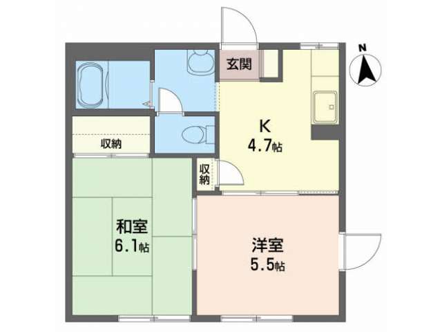 | 詳細間取 | 2K (洋5.4帖×1、洋6.1帖×1、キッチン4.7帖) | ||
