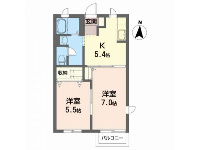 | 詳細間取 | 2K (洋5.5帖×1、洋7帖×1、キッチン5.4帖) | ||